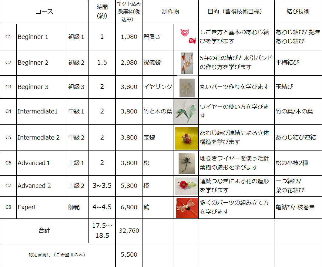 体験で一度だけ、趣味として数回、また水引細工の創作や教室の運営などに最低限度必要とされる基礎技術の習得のため、8つのステップ(C1~C8)をご用意しました。